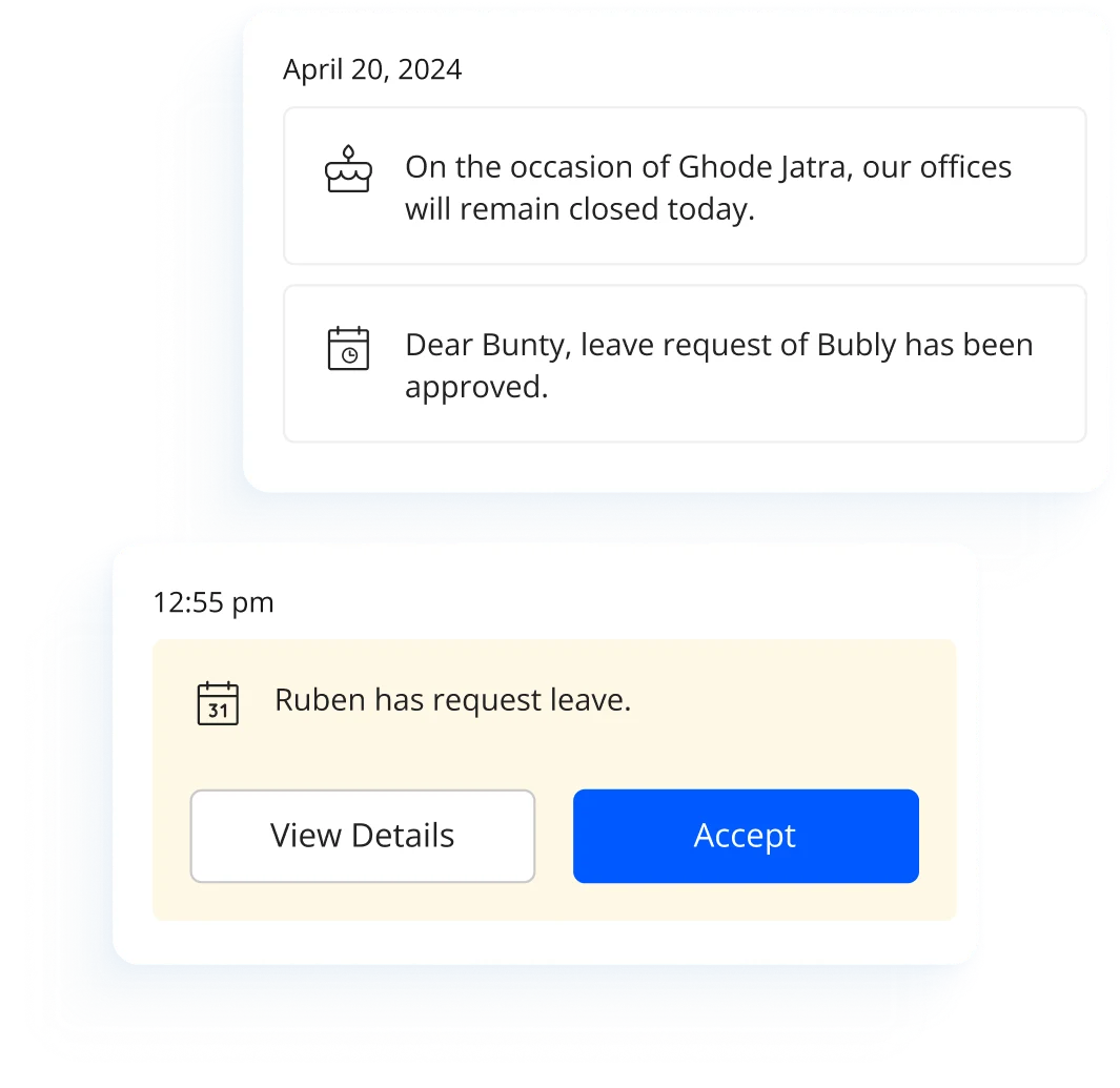 Boost engagement with an interactive feed. Share company news, events, and policy updates via a dynamic feed. Maximize visibility and employee engagement with likes, comments, scheduling, auto-expiry, and targeted email or push notifications.